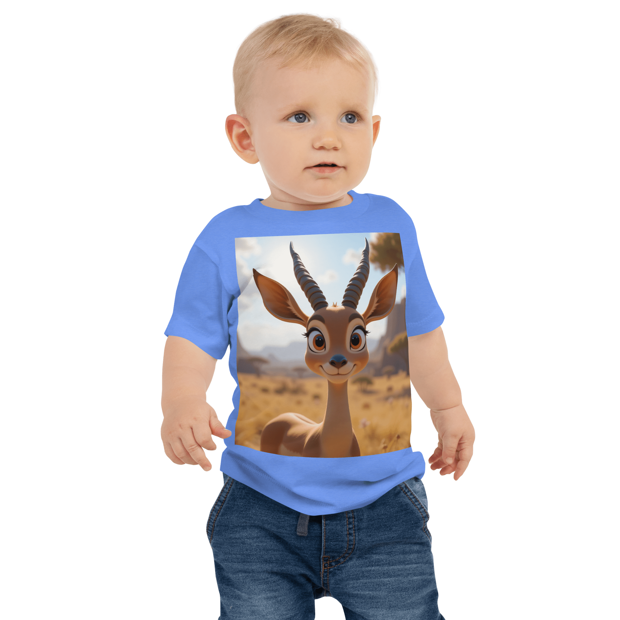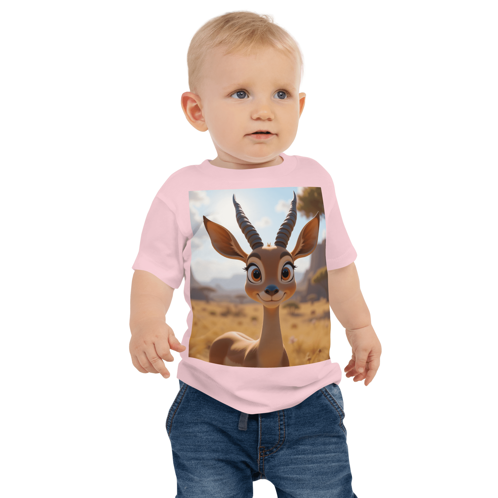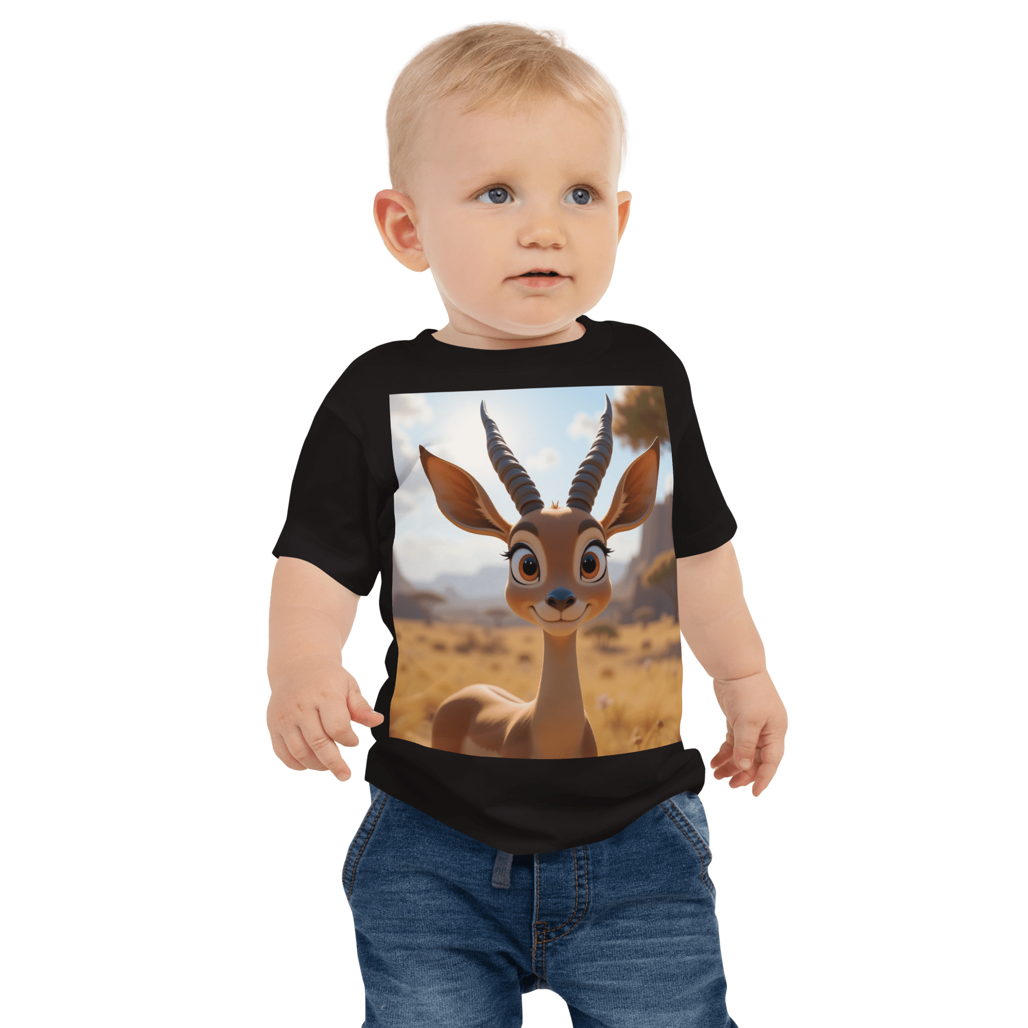 Leap into comfort and joy with our Antelope-themed Organic Cotton Baby T-Shirt | soft, breathable, and gentle on delicate skin. A thoughtful, eco-friendly gift for growing little ones.