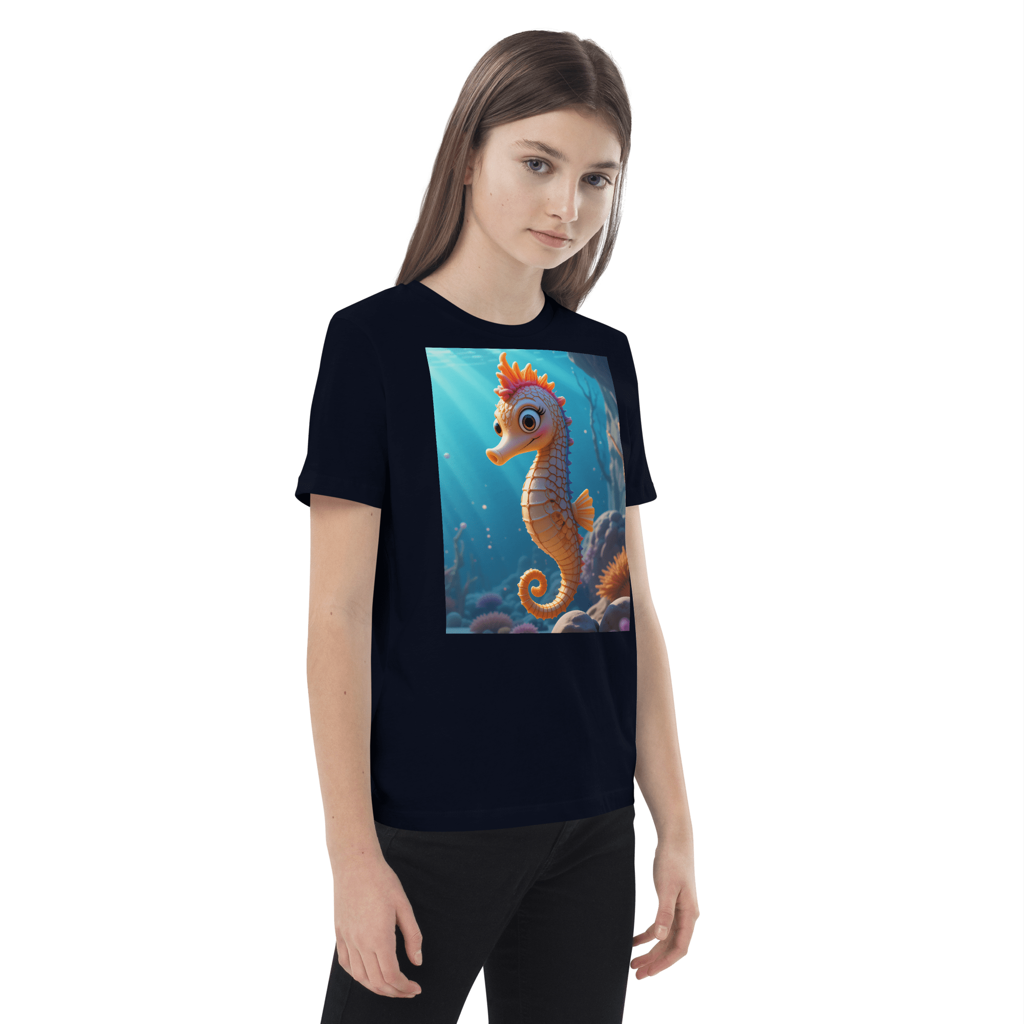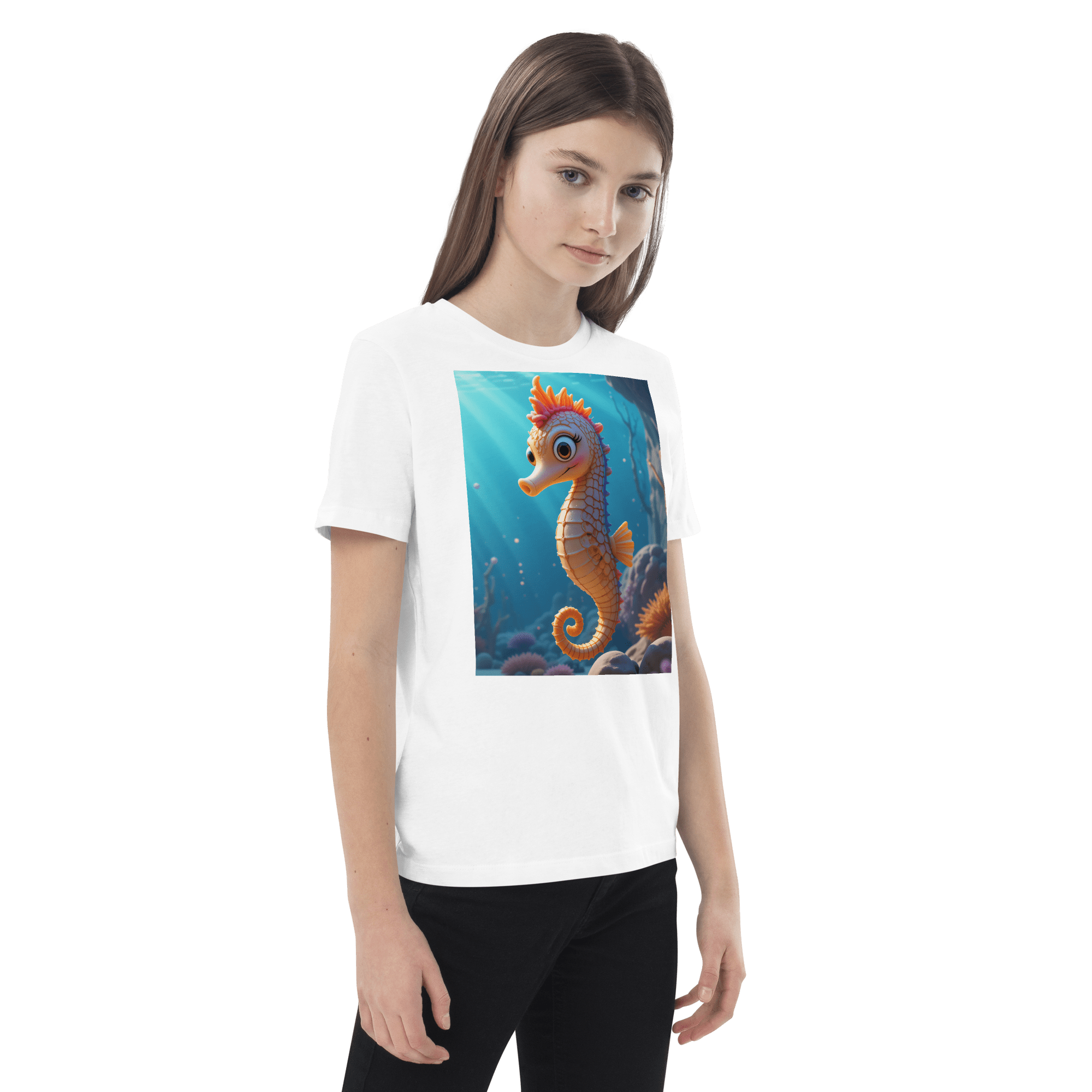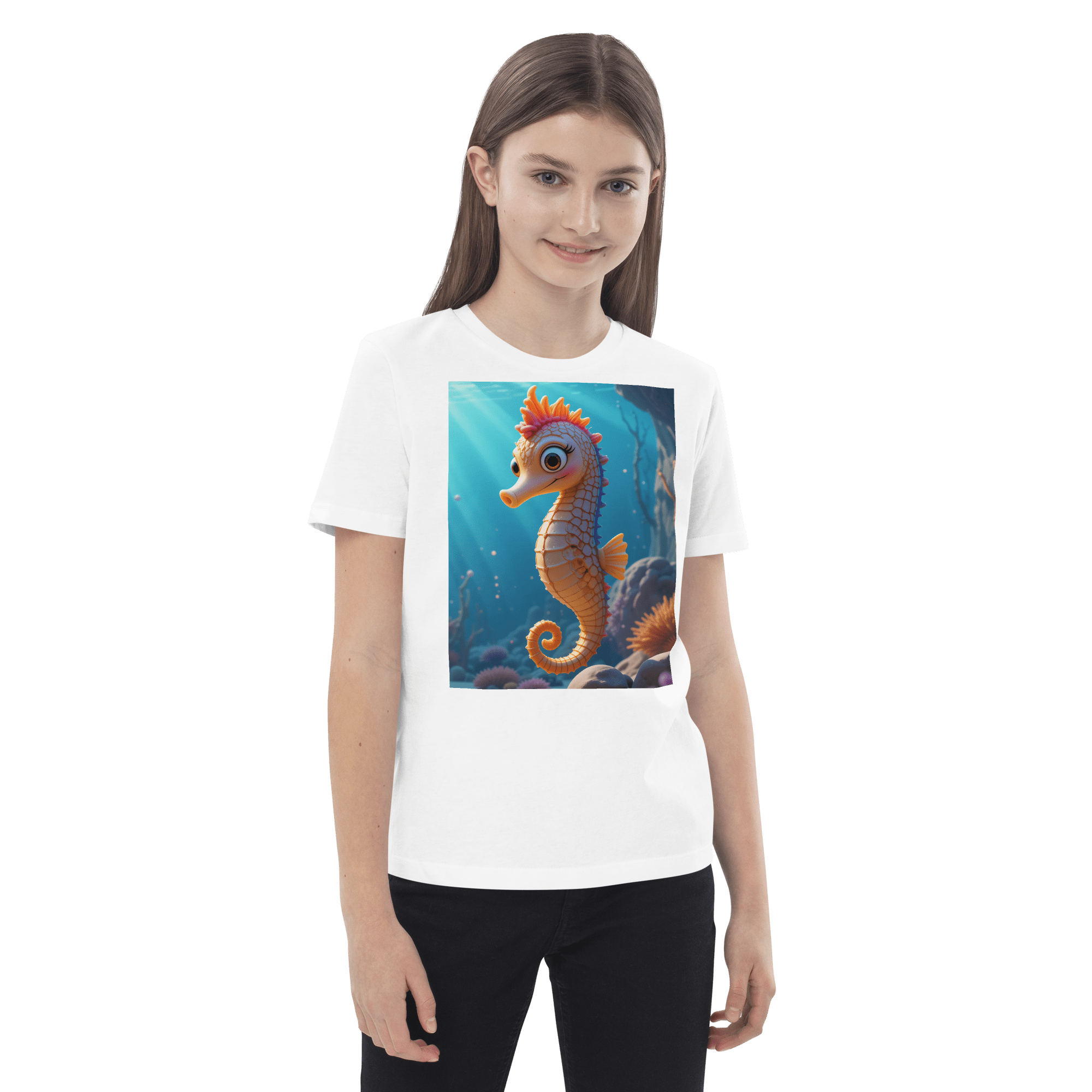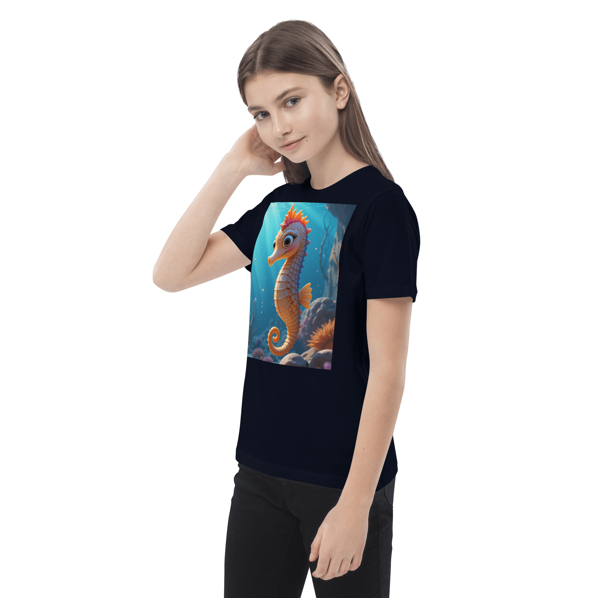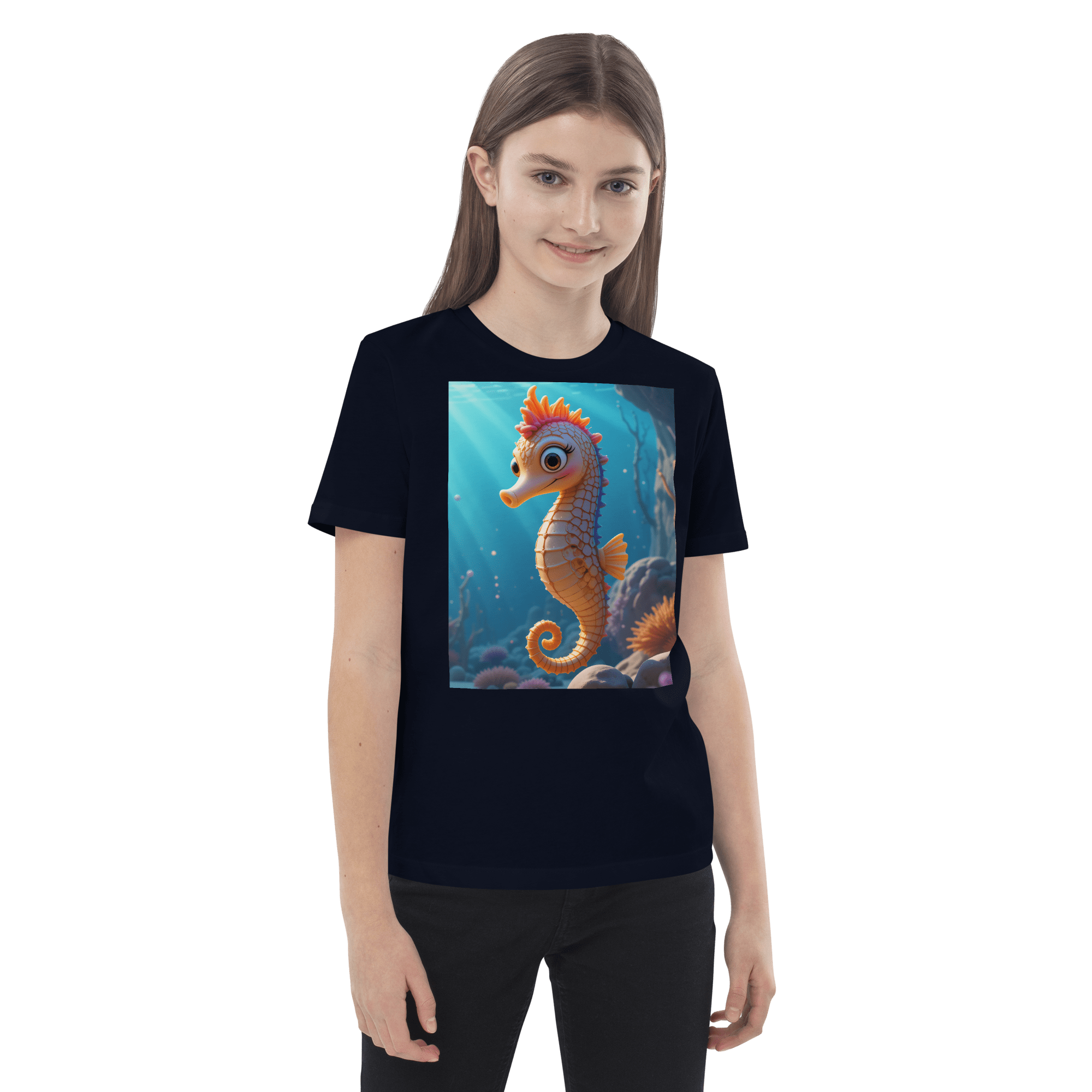 Swim into creativity and confidence with our Seahorse-inspired Organic Cotton Kids T-Shirt | soft, breathable, and perfect for school days, playdates, and weekend fun.